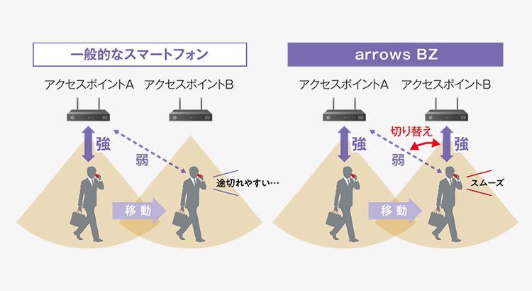 一般的なスマートフォンは、Wi-Fiに接続すると電波が弱まってもなるべくWi-Fiに接続しつづけようとする性質がありますが、職場内を移動しながら使われる内線利用では通話が途切れてしまいます。そこで、arrows BZはWi-FiでVoIP通話をしていても途切れにくいWi-Fiハンドオーバーに対応。通話中に移動しても、アクセスポイントが自動的に切り替わるので、倉庫や病院などの広い場所でも途切れる心配がありません。