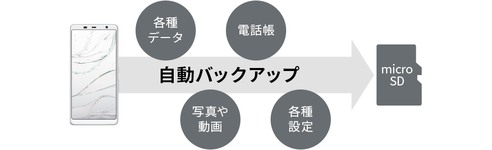 電話帳・写真・動画・文字入力の設定など、大切なデータや細かな設定情報を自動でバックアップ。万が一、本体が壊れてしまっても、元通りに戻すことが可能です。