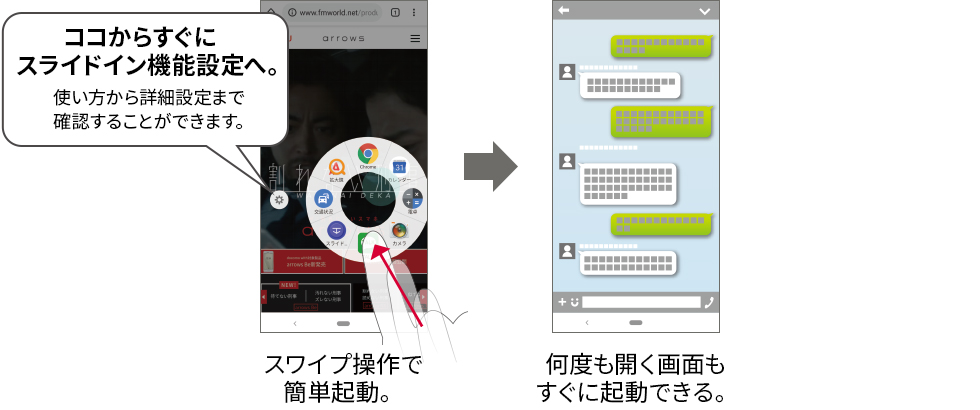 スワイプ操作で、よく使うアプリやショートカットをすぐに起動可能。たとえば、トークアプリ内の個別トーク画面まで1ステップでアクセスできます。