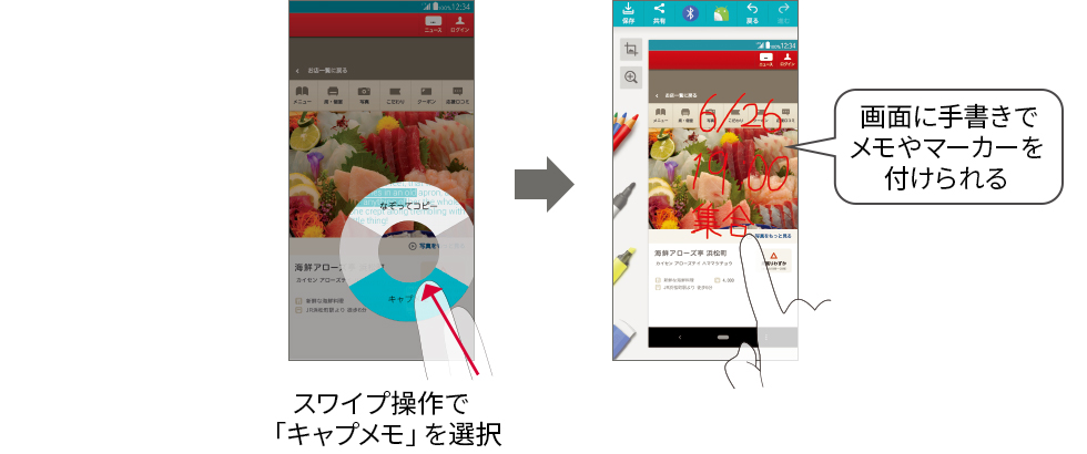スワイプ操作をするだけで簡単に起動し、画面を保存できます注6。マップ画像に線をひくなど、そのまま上から手書きしてメール送信やSNSへ投稿することができます。Webなどから画像をキャプチャしたと同時に書き込みや切り取りが可能に!