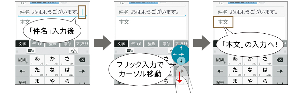 フリック操作でカーソルを上下左右にラクラク動かせる。