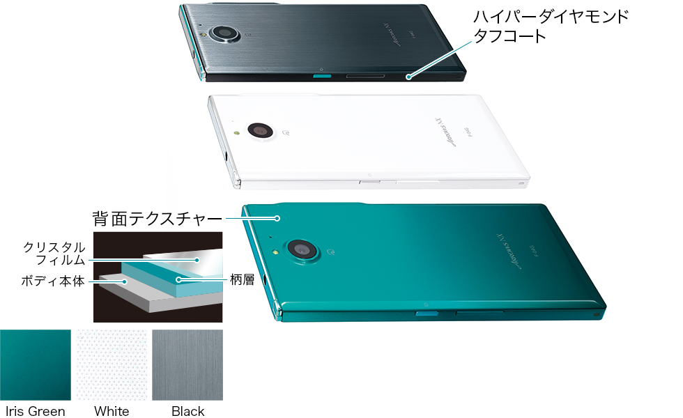 背面テクスチャーは、3色それぞれに異なる柄を採用。透明フィルムと柄フィルムをボディと一体成型し色がはがれにくく、美しさを保ちます。