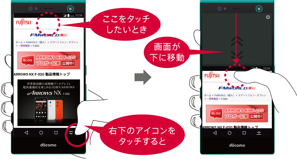画面全体を下方向に移動させることで、指の届かなかった部分も、片手でラクラク操作できます。