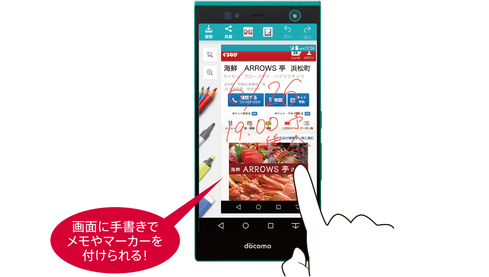 画面の外から中央へ指を動かすスワイプ操作をするだけでカンタンに起動し、画面を保存できます注1。そのまま上から手書きしてメール送信やSNSへ投稿することができるので友達に集合場所を教えるときなどに便利です。