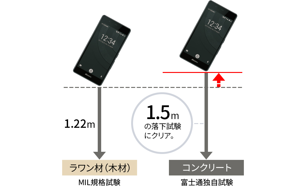 日本人男性の平均身長で耳にスマートフォンを当てた高さを想定した1.5mの高さから、コンクリートへの落下試験注1を実施しています。