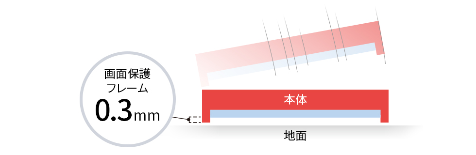 画面周囲に0.3mmのフチを立て、落下時にも画面が直接地面に当たりにくくなります。