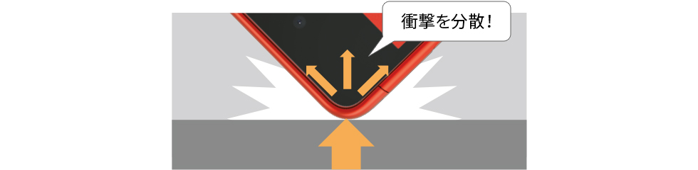 コーナーをラウンドさせることで落下時の衝撃を分散させ、画面への衝撃を最小限に抑制します。