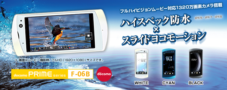 フルハイビジョンムービー対応1320万画素カメラ搭載 ハイスペック防水(IPX5・IPX7・IPX8)×スライドヨコモーション docomo PRIME series F-06B 注:画面はムービー撮影時。フルHD(1920×1080)サイズです。