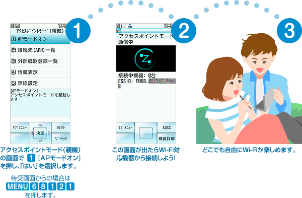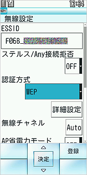 F-06Bではカンタンにアクセスポイントに接続できるAOSS接続やWPS接続、また現在地のWi-Fi網の検索ができます。