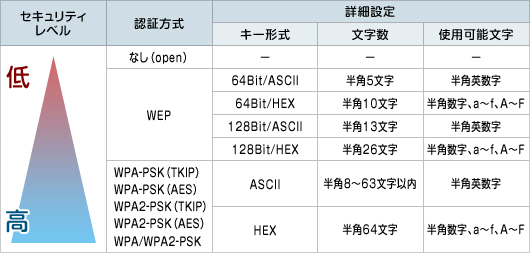 接続するWi-Fi対応機器によって対応している認証方式が異なりますので、詳しくは接続するWi-Fi対応機器の取扱説明書などでご確認ください。