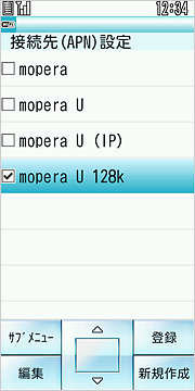 FOMA通信での接続先を決定します。接続先によって通信速度や、mopera Uへの契約の有無、パケット定額制の上限額(従量)が異なります。