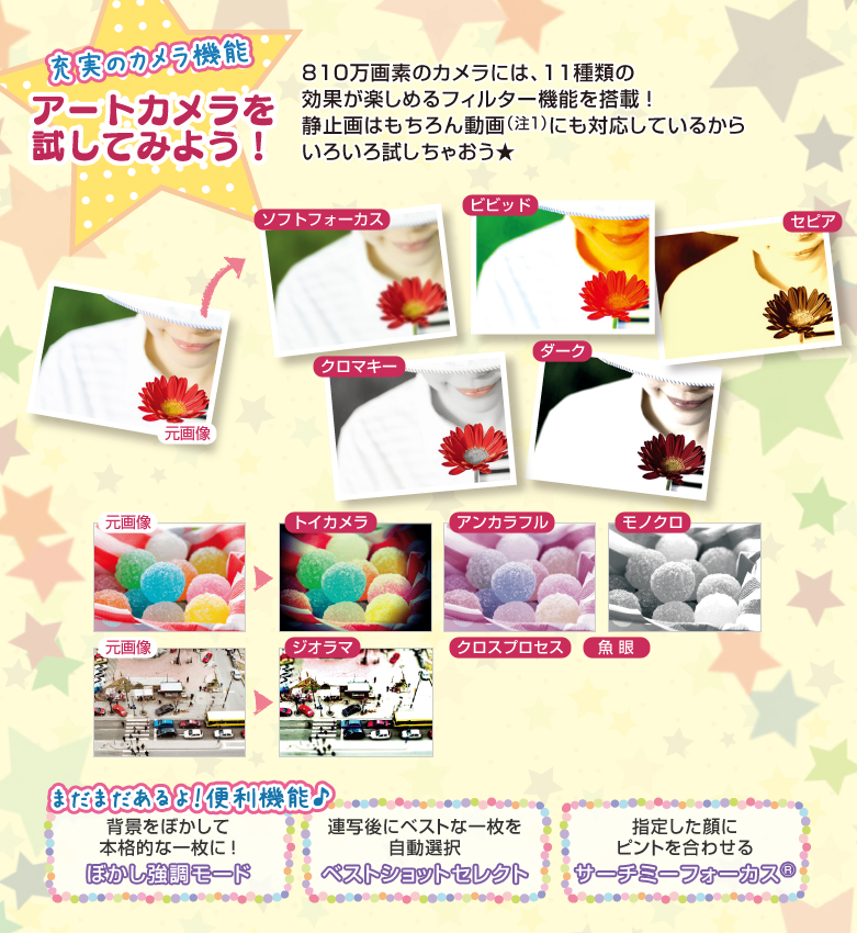 【充実のカメラ機能 アートカメラを試してみよう!】 810万画素のカメラには、11種類の効果が楽しめるフィルター機能を搭載!静止画はもちろん動画(注1)にも対応しているからいろいろ試しちゃおう。/ソフトフォーカス、ビビッド、セピア、クロマキー、ダーク、トイカメラ、アンカラフル、モノクロ、ジオラマ、クロスプロセス、魚眼/まだまだあるよ!便利機能/背景をぼかして本格的な一枚に! ぼかし強調モード/連写後にベストな一枚を自動選択 ベストショットセレクト/指定した顔にピントを合わせる サーチミーフォーカス(R)