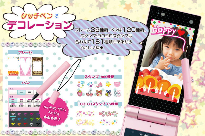 【タッチペンでデコレーション】 フレーム39種類、ペンは120種類、スタンプ・コロコロスタンプは合わせて181種類もあるからうれしいね。