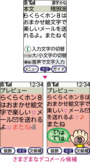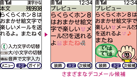 文章に合ったデコメールを自動で作れるおまかせ絵文字。デコメールの候補が豊富に表示されるので、華やかなメールをかんたんに作れます。
