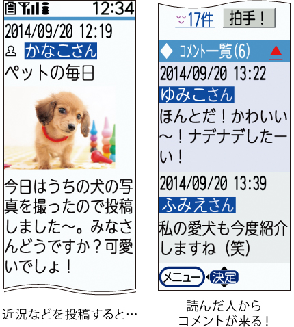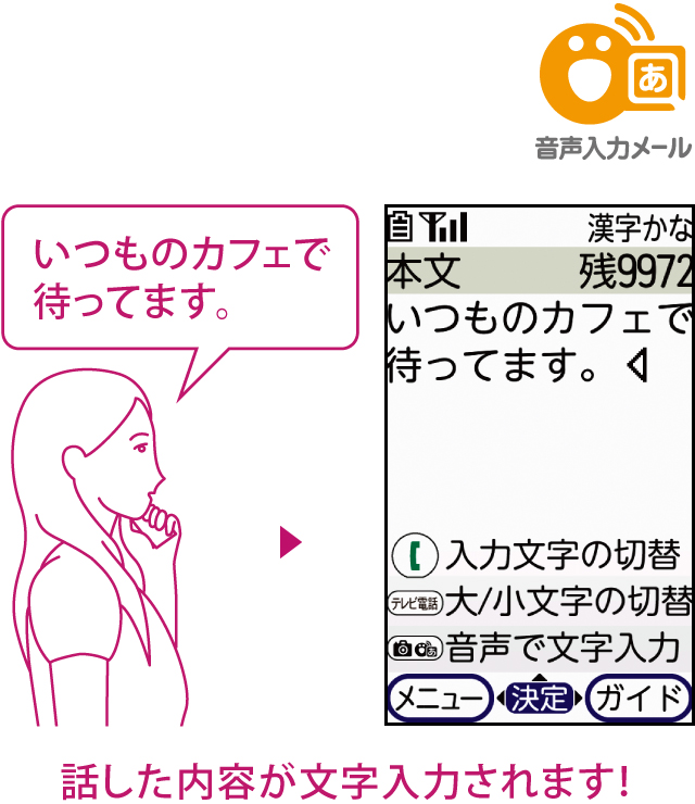 マイクに向かって話すだけで、メールの題名や本文が入力される便利な音声入力メールに対応しています。