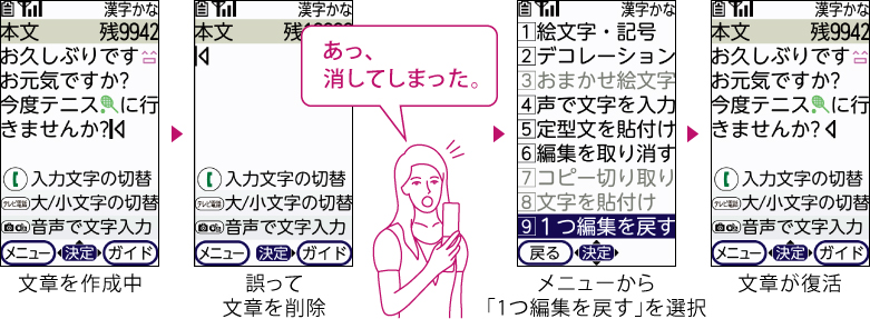 本文入力中などに間違えて文字を消してしまっても、1つ前の状態に戻して復活させられるあんしん機能つきです。