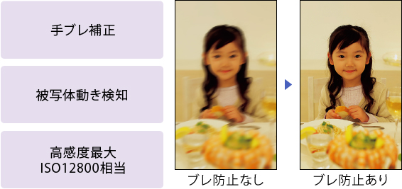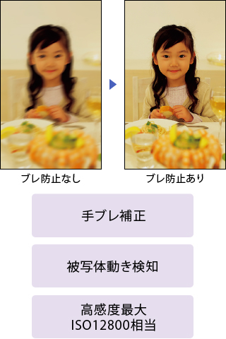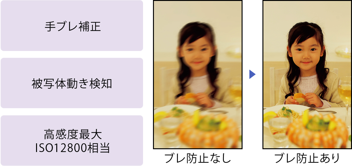 手ブレ補正、被写体動き検知、高感度最大 ISO12800相当