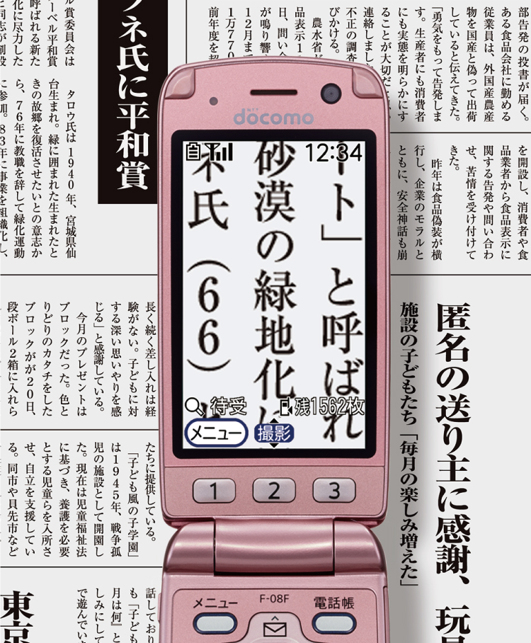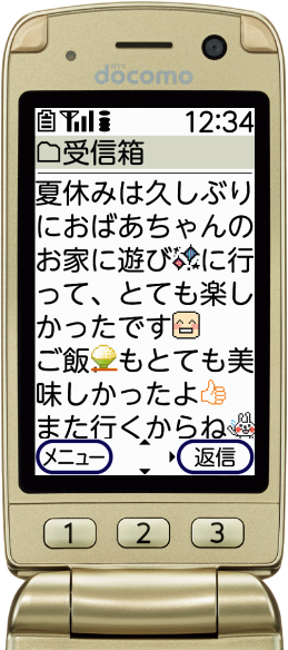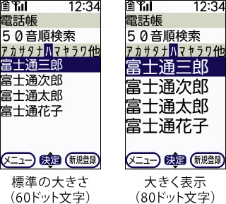 受信メールや送信済みメールの文字、さらによく使う電話帳一覧の文字を大きく表示することができます。最大80ドットの大きさで表示できます。