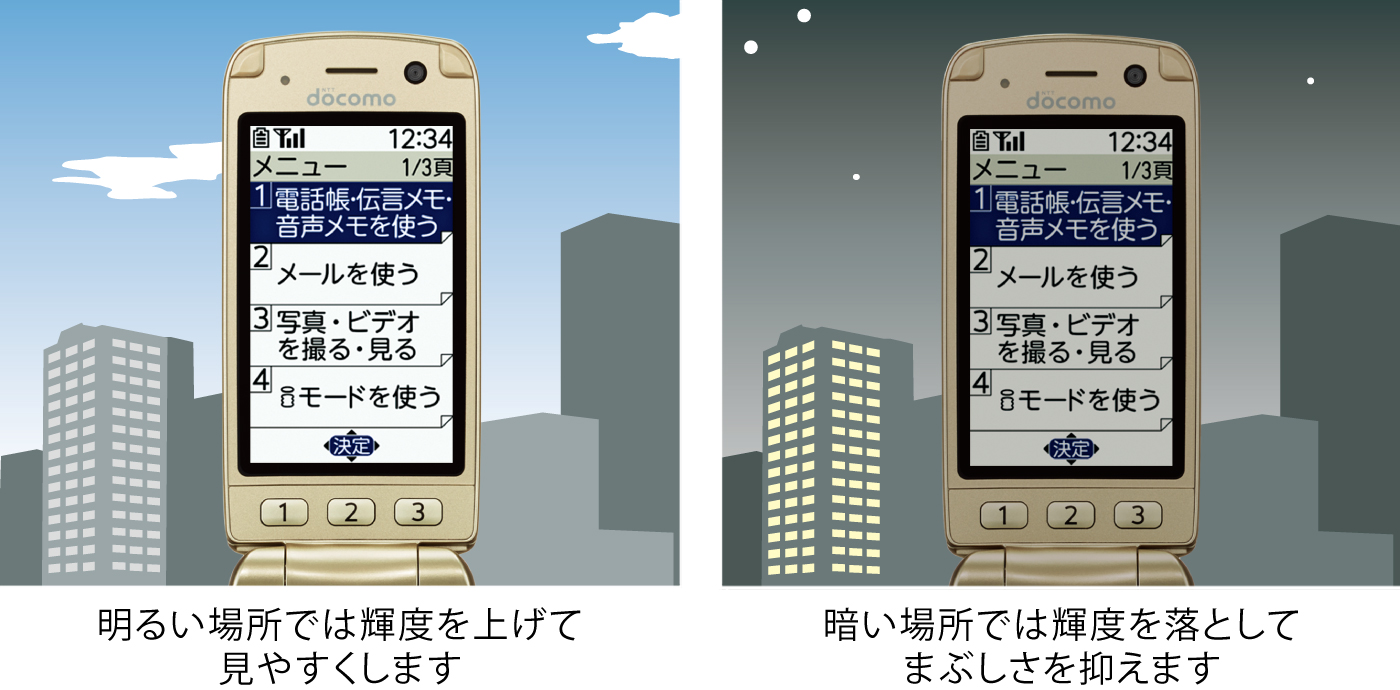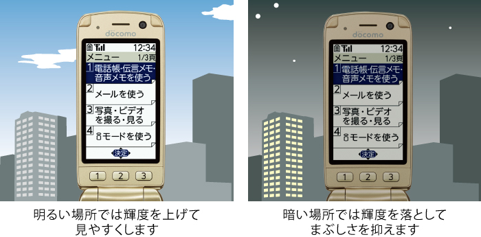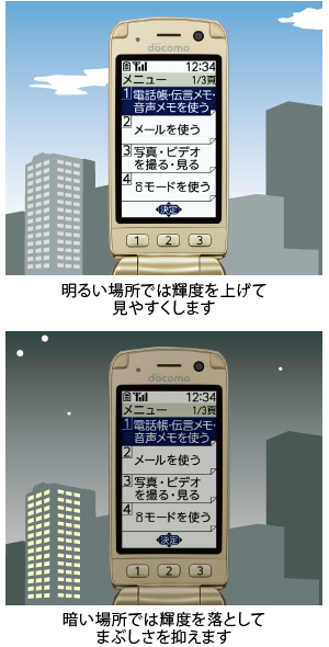 明るい場所では輝度を上げて見やすくします/暗い場所では輝度を落としてまぶしさを抑えます