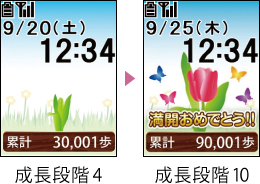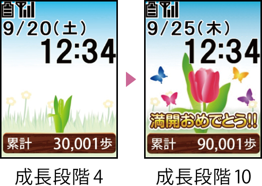 歩数計に連動した待受画面(背面)をご用意しました。歩数が増えるほどに、10種類の花が成長して小鳥や蝶などのアニメーションがランダムに登場します。