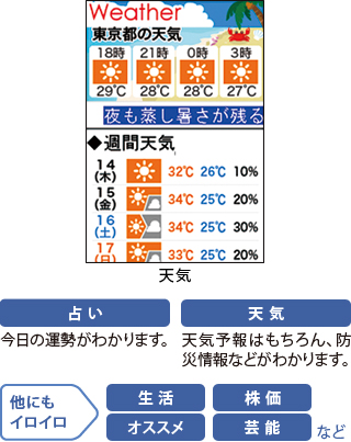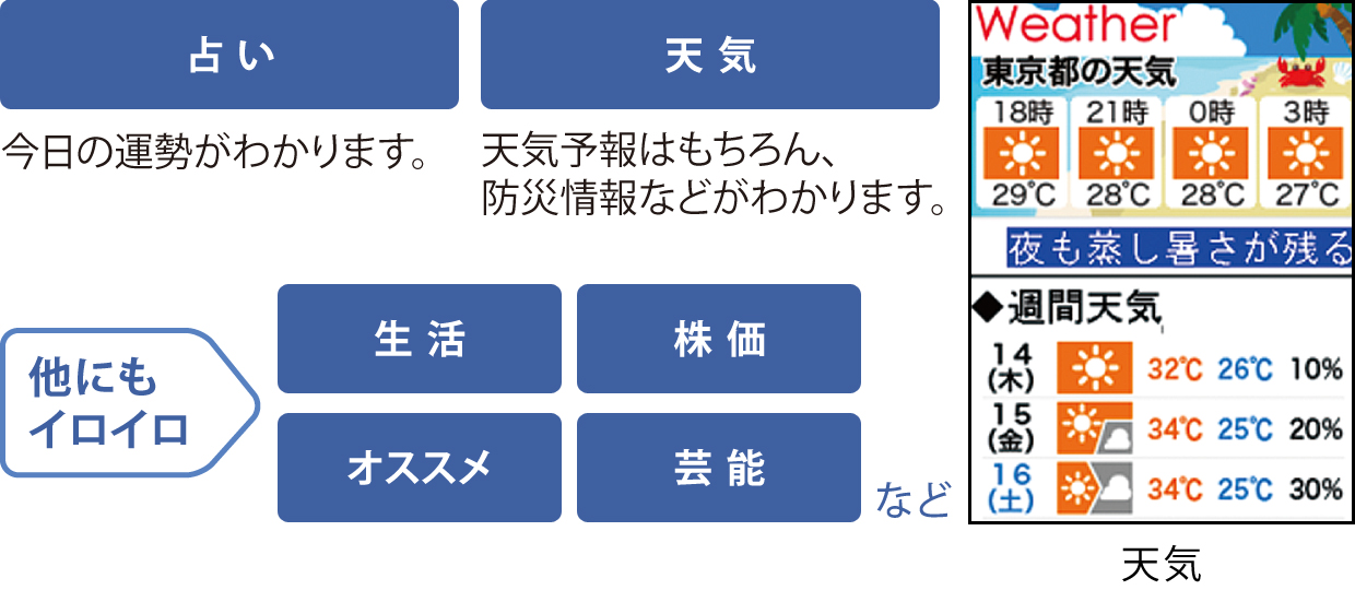 占い 今日の運勢がわかります。/天気 天気予報はもちろん、防災情報などがわかります。/他にもイロイロ 生活、株価、オススメ、芸能 など