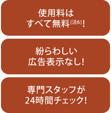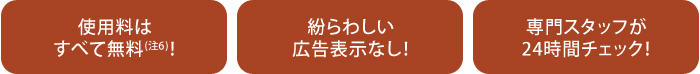 使用料はすべて無料(注6)!紛らわしい広告表示なし!専門スタッフが24時間チェック!