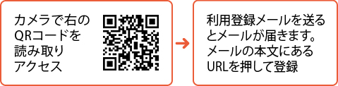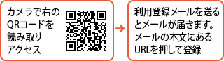 カメラで右のQRコードを読み取りアクセス ⇒ 利用登録メールを送るとメールが届きます。メールの本文にあるURLを押して登録