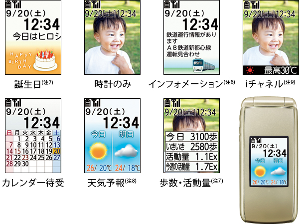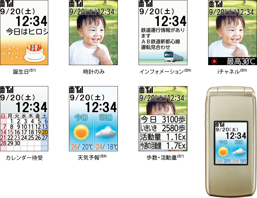 誕生日(注7)、時計のみ、インフォメーション(注8)、iチャネル(注9)、カレンダー待受、天気予報(注8)、歩数・活動量(注7)