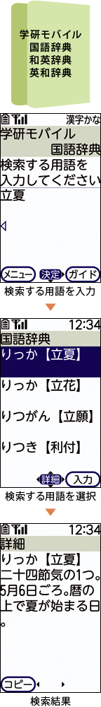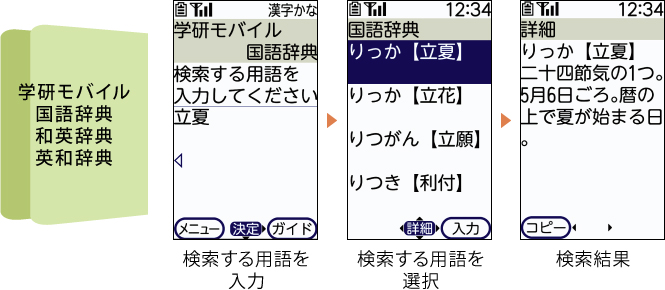 学研モバイル、国語辞典、和英辞典、英和辞典/検索する用語を入力 ⇒ 検索する用語を選択 ⇒ 検索結果