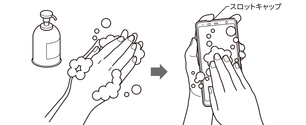 1. 泡ハンドソープまたは食器用洗剤を手にとり、泡立ててください。本端末を手のひらに乗せ、前面と背面を泡でこするように洗ってください。