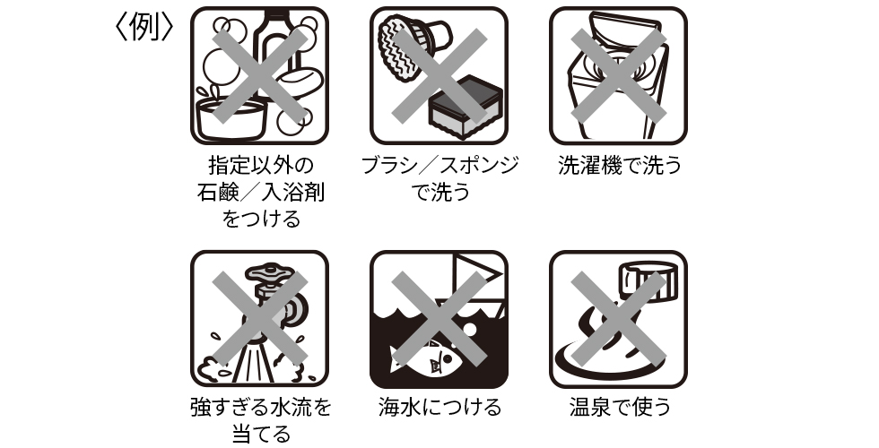 - 指定以外の石鹸、入浴剤、シャンプー、リンス、洗顔剤、メイク落とし、歯磨き粉などで洗わないでください。付着した場合はすぐに水で洗い流してください。
