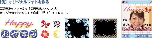 静止画の一部分を切り抜いて、静止画・動画撮影に使えるオリジナルフレームを作成できます。 また、文字やスタンプ、絵文字を貼り付けてオリジナルフォトを作ったり、静止画を縮小してオリジナルスタンプを作れたりと、いろいろ遊べる画像編集機能が満載です。 |