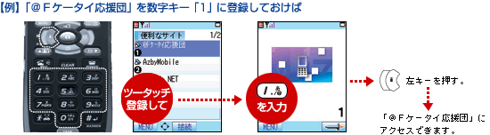 0〜9の10個の数字キーに、よく利用するi モードサイトのURLを登録できます。 2回のキー操作でiモードサイトへのアクセスができるので、とても便利です。 |