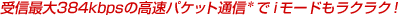 | 504iシリーズの約13倍の高速パケット通信(384kbps[受信の場合])が、iモードへのアクセス&ダウンロードをより快適なものにします。 * 通信環境や輻輳状態の影響により通信速度が変化するベストエフォートによる提供です。 |