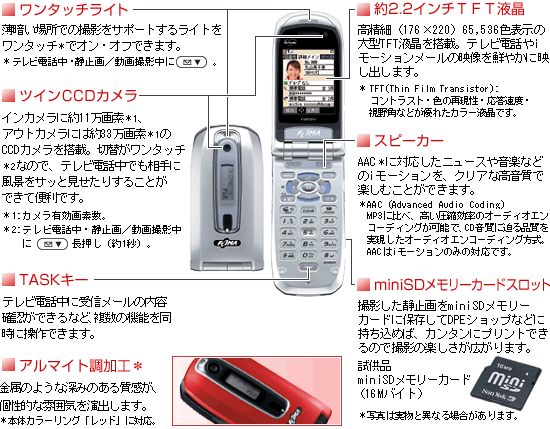 VGAの大きなサイズの静止画をメール※4で送ったり、miniSDメモリーカードを使って、DPEショップなどでプリントしたり。撮影の楽しさがいっそう広がります。