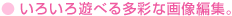 撮影画像に文字やスタンプを貼り付けてオリジナル・フォトがつくれたり、写真の一部分を切り抜いて、自分だけのオリジナル・フレームがつくれたりと、いろいろ遊べる画像編集機能が満載です。