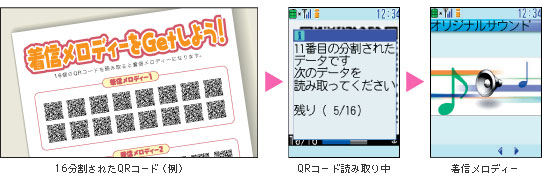 カメラを利用して、バーコード(JANコード・QRコード)に登録してあるURLや電話番号などを読み取ることができます。さらに、ひとつのデータが最大16分割されているQRコードの読み取りにも対応。