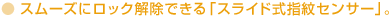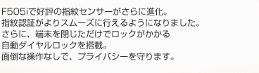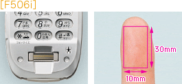 F505iで好評の指紋センサーが、さらに進化しました。F506iでは指紋の特徴が採りやすいスライド式を採用。指先でセンサー部分をスライドさせるだけで、セキュリティ・ロックの解除がスムーズに行えます。