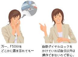 F506iの端末暗証番号は、従来の4桁から最大8桁までと桁数が2倍に増加※。複雑化した暗証番号で個人情報をしっかりと守るうえ、指紋センサーを使って簡単に解除できるので便利です。