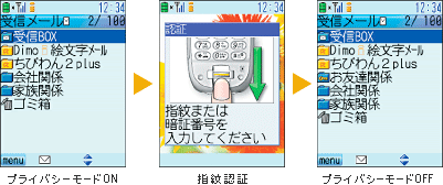 人に見られたくないメールや写真が保存されているフォルダを、ワンタッチ※1でサッと隠せるプライバシーモード※2は、指紋センサーの採用により解除操作もワン・アクション。また、一度プライバシー