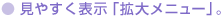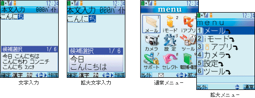 表示画面には通常メニューのほかに、文字が見やすい、拡大メニューを用意しました。拡大メニューには30ドットの大きな文字を採用。また、メニューだけでなく、よく使うメールや電話帳、文字入力に関する文字も拡大できます。