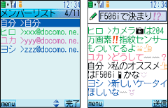 あらかじめ登録してある複数の相手(最大10人)と会話感覚で、iモードメールの送受信ができます。また、相手ごとに表示する文字色(11色)を設定することもできます。