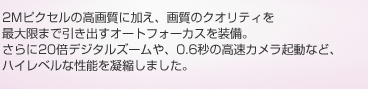 2Mピクセルの高画質に加え、画素のクオリティを最大限まで引き出すオートフォーカスを装備。さらに20倍デジタルズームや、0.6秒の高速カメラ起動など、ハイレベルな性能を凝縮しました。