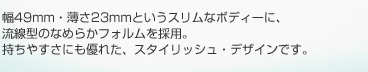 幅49mm・薄さ23mmというスリムなボディに、流線型の滑らかなフォルムを採用。持ちやすさにも優れた、スタイリッシュ・デザインです。