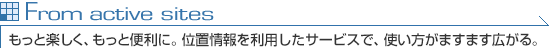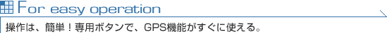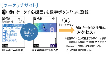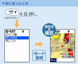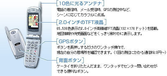 | 位置情報を利用した、「位置サイト」サービスへアクセスすれば、ますます使えるケータイへ。たとえば、もっと詳細な地図情報を得たり、今いる場所の周辺にあるレストランを近い順に表示したりと、使い方は自由自在。いつも使う位置サイトをワンタッチ設定しておけば、位置情報を利用した位置サイトのサービスをGPSボタンの長押しで、簡単に受けることができます。 | |||||||||||||||||||||||||||||||||||
