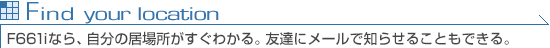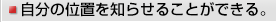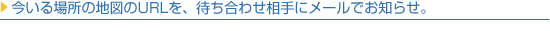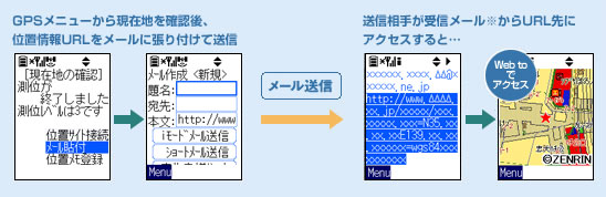 | デートや友達との待ち合わせのときなど、相手に位置情報URLをメールで送って、今いる場所を簡単に知らせることができるので、道案内に困ることもありません。 | |||