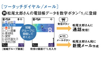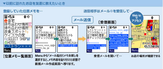 | 確認した位置情報を、電話番号やメールアドレス、メモとともに、「位置メモ」として保存することができます。たとえば、気に入ったお店を位置メモ登録しておけば、位置メモ内容を簡単にメールに貼り付けて送ることができるので、友達にお店の場所を教える場合などに便利です。 | |||||||||