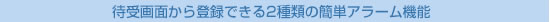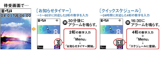 | 1〜60分のタイマーのアラームを簡単に設定できる「お知らせタイマー」と、電話の時間や外出時間といった、ちょっとした時間を時間指定のアラームでお知らせする「クイックスケジュール」の2種類の簡単アラーム機能を搭載。 | ||||||