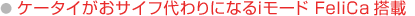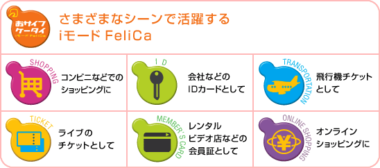 FeliCaとは、かざすだけでデータの読み書きができる非接触ICカード技術方式のひとつ。携帯電話が FeliCaに対応すると、携帯電話を読み取り装置にかざすだけで電子マネーを使ってショッピングの支払いなどができるようになります。