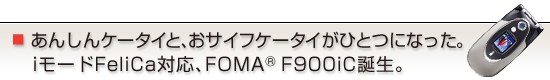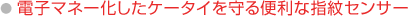 iモードFeliCa搭載により実現したケータイの電子マネー化は便利になった反面、セキュリティの充実が求められます。F900iCにはiモードFeliCaを守る多彩なロック機能を搭載。その上、ロック解除は指紋センサーをサッと指でスライドするだけ。すばやくスマートに、セキュリティロック機能をご利用いただけます。